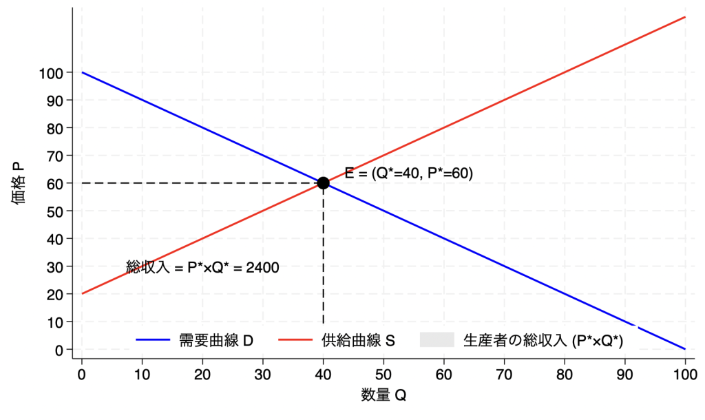需要と供給の図を用いて、均衡価格、均衡数量、および生産者が受け取る総収入を示しなさい。
